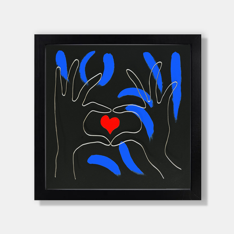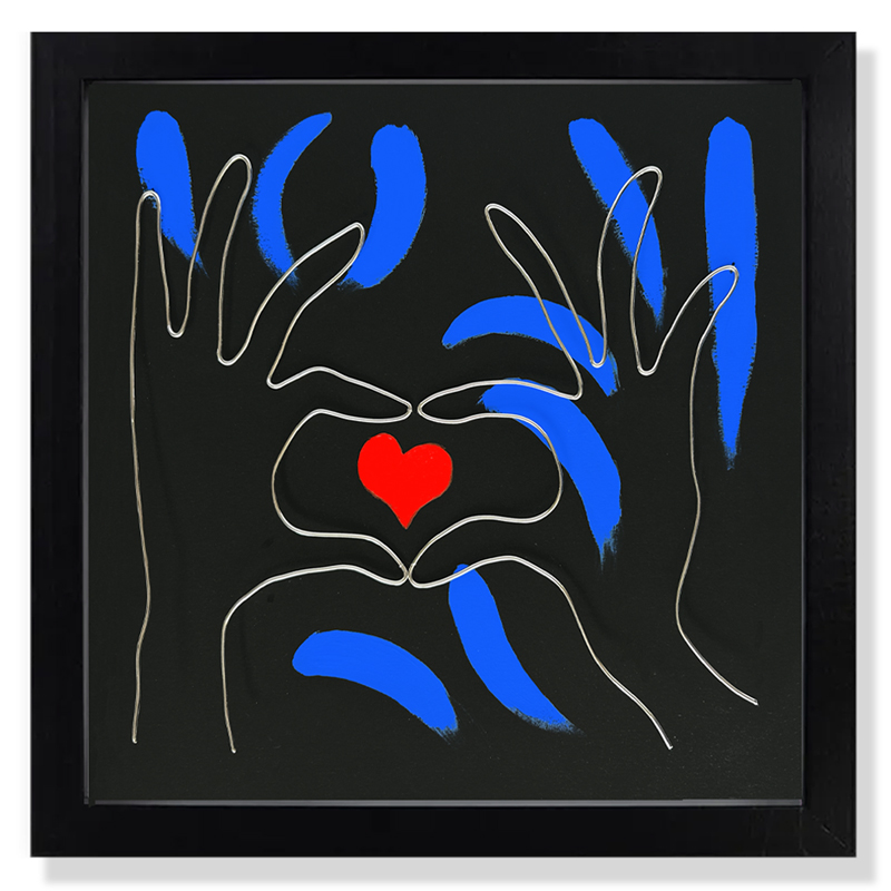All you need is...Fil de métal sculpté et peinture acrylique sur papierCadre 3D