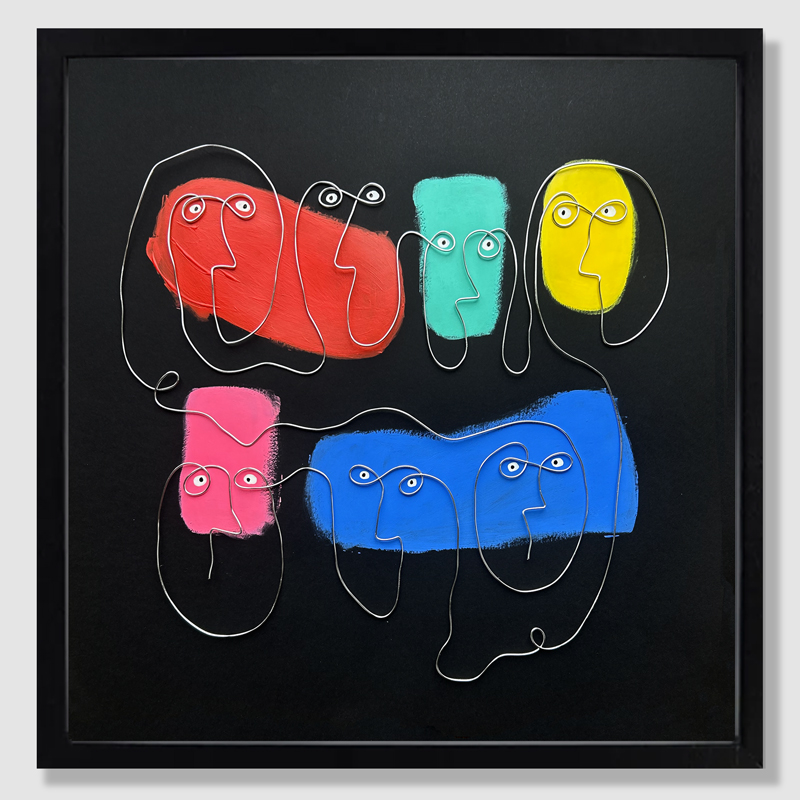 Sisters and brothersFil de métal sculpté et peinture acrylique sur papierCadre 3D
